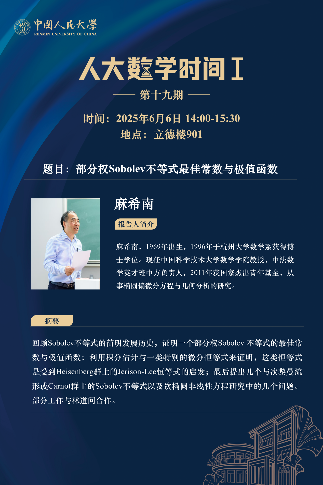 为促进学科交流融合、拓宽师生学术视野、释放科研创新活力,助力人大数学学科走向一流,古天乐代言太阳集团设立“人大数学时间”,以专题研讨、高端学术论坛为载体,搭建数学思想充分碰撞、优秀人才不断涌流、创造活力竞相迸发的舞台。“人大数学时间”将持之以恒,久久为功,立志通过交流与创新、提出重大问题,引领数学学科及相关领域的创新与发展,成为对我国数学发展有贡献意义的平台。以下为“人大数学时间I”第十九期信息: