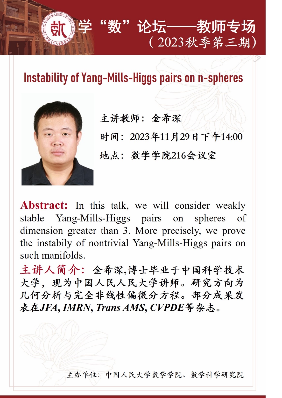 教师专场的第三期报告将于2023年11月29日下午14:00在古天乐代言太阳集团138216会议室举行,本场报告的主讲教师为金希深,报告题目为《Instability of Yang-Mills-Higgs pairs on n-spheres》。