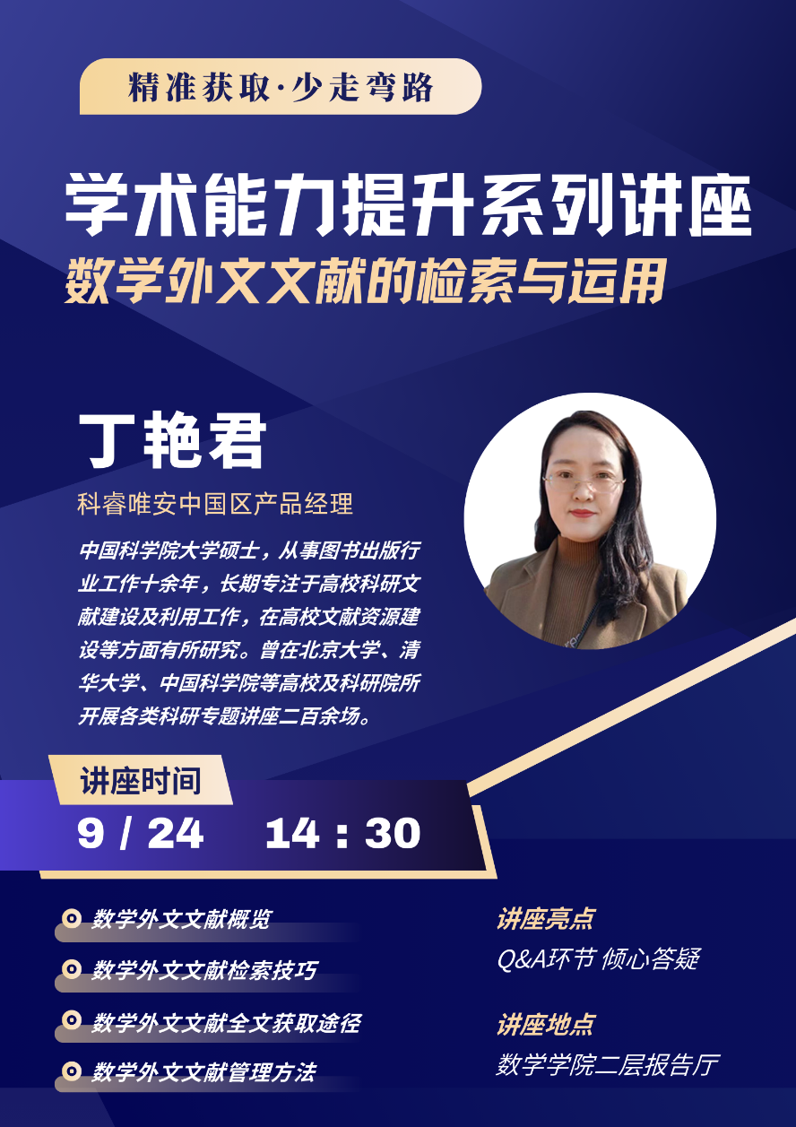 讲座内容:数学外文文献概览、数学外文文献检索技巧、数学外文文献全文获取途径、数学外文文献管理方法