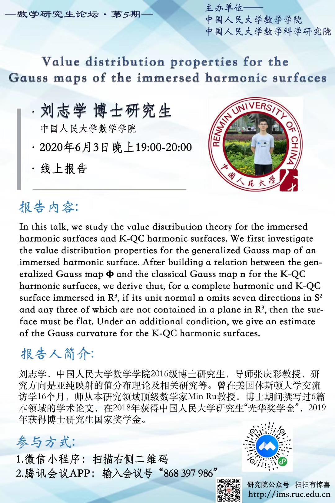 数学研究生论坛第5期——Value distribution properties for the Gauss maps of the immersed harmonic surfaces