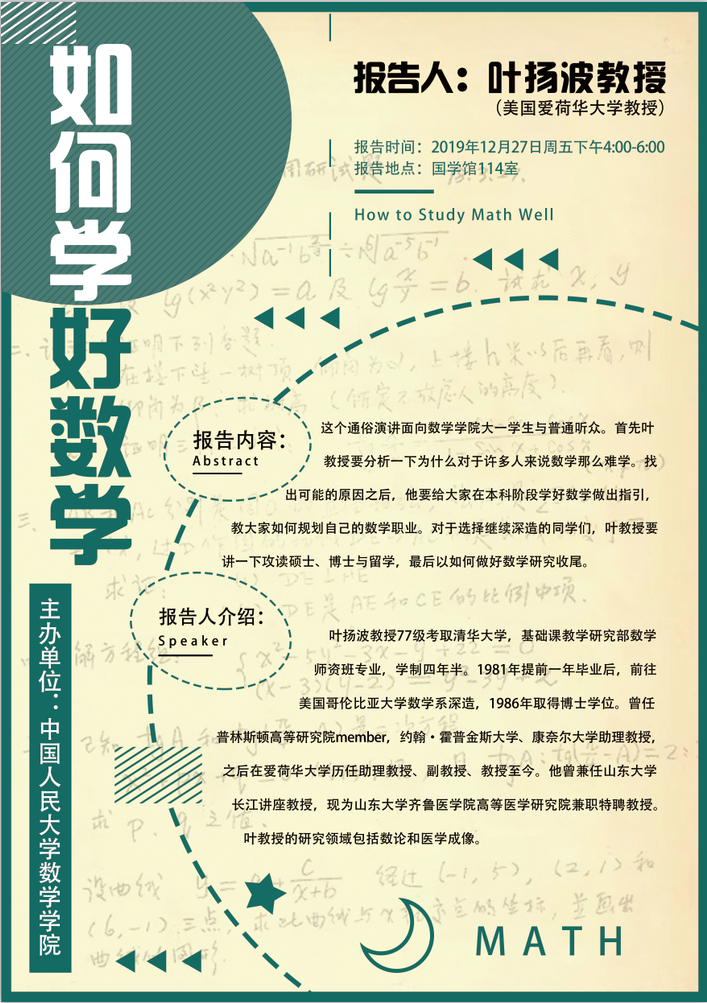 这个通俗演讲面向古天乐代言太阳集团138大一员工与普通听众。首先叶教授要分析一下为什么对于许多人来说数学那么难学。找出可能的原因之后,他要给大家在本科阶段学好数学做出指引,教大家如何规划自己的数学职业。对于选择继续深造的同学们,叶教授要讲一下攻读硕士、博士与留学,最后以如何做好数学研究收尾。