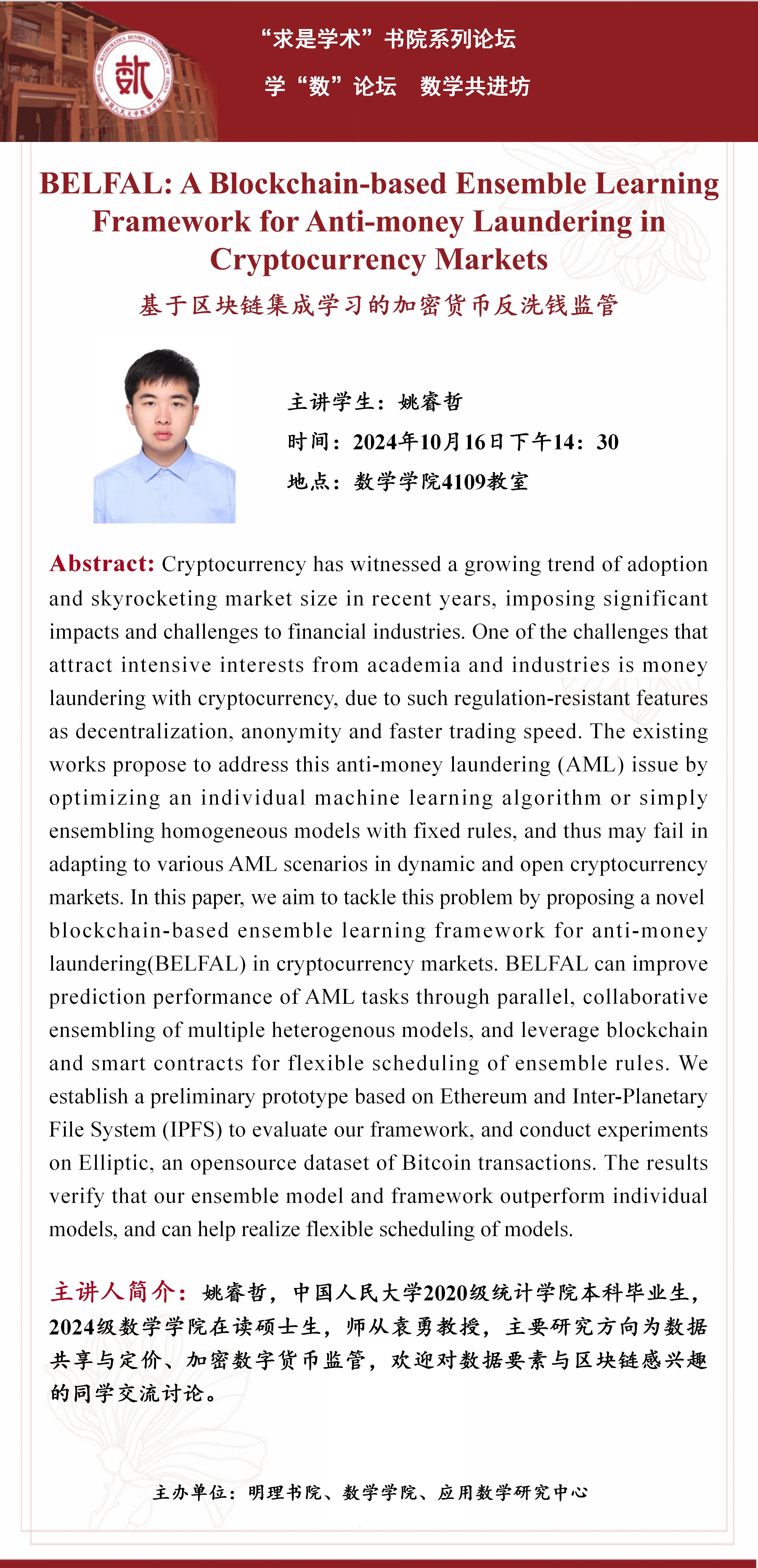本场报告类型为学术类,将于2024年10月16日(星期三)下午14:30,在古天乐代言太阳集团1384109教室进行,报告主讲人为硕士一年级姚睿哲同学,报告题目为《BELFAL: A Blockchain-based Ensemble Learning Framework for Anti-money Laundering in Cryptocurrency Markets》