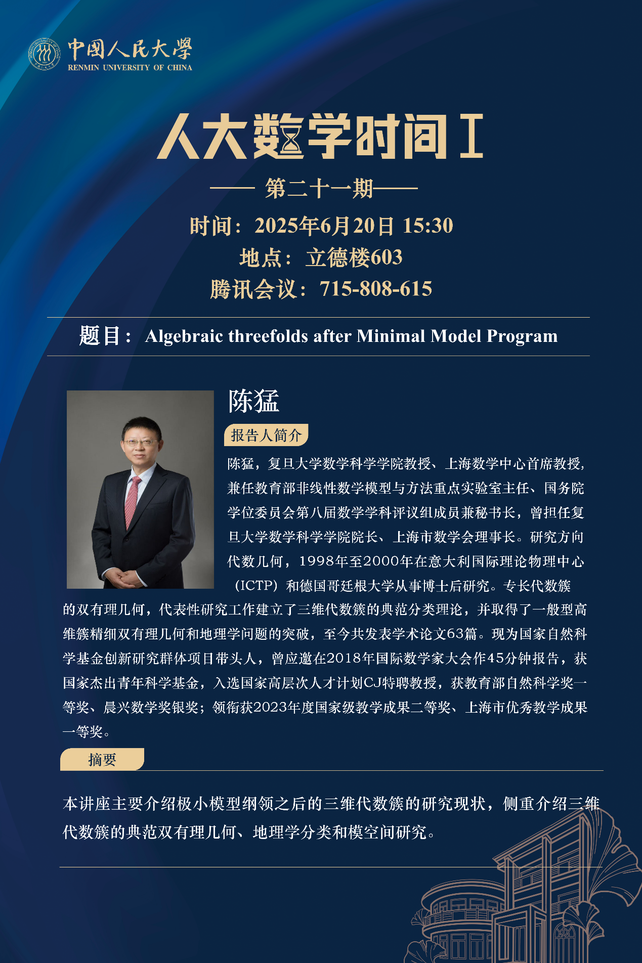 为促进学科交流融合、拓宽师生学术视野、释放科研创新活力,助力人大数学学科走向一流,古天乐代言太阳集团设立“人大数学时间”,以专题研讨、高端学术论坛为载体,搭建数学思想充分碰撞、优秀人才不断涌流、创造活力竞相迸发的舞台。“人大数学时间”将持之以恒,久久为功,立志通过交流与创新、提出重大问题,引领数学学科及相关领域的创新与发展,成为对我国数学发展有贡献意义的平台。以下为“人大数学时间I”第二十一期信息: