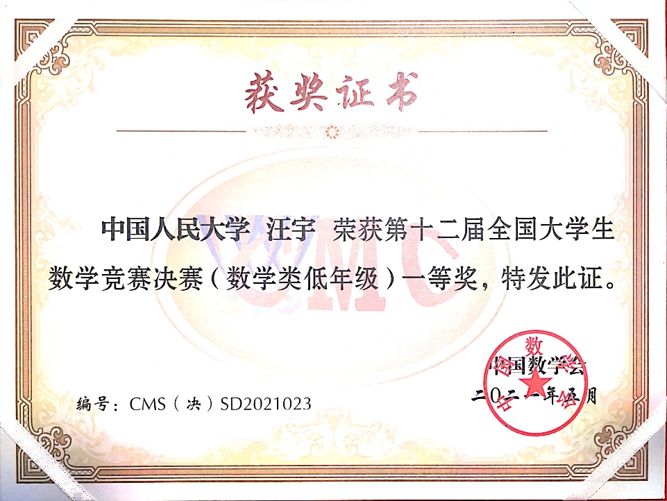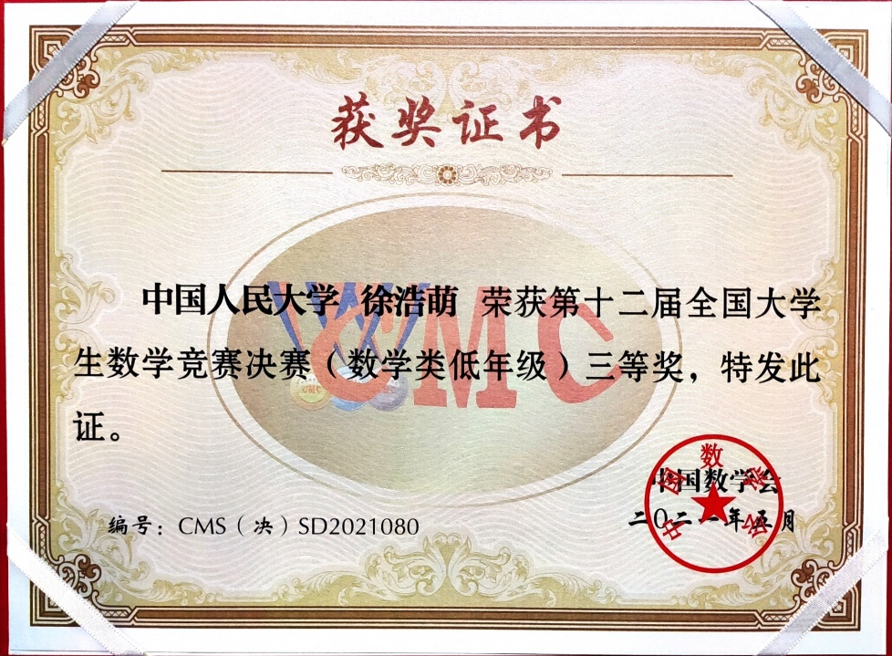 第12届全国老员工数学竞赛决赛于2021年5月16日在吉林大学成功落下帷幕。本次竞赛全国共有32个赛区206921人报名参加初赛,从中选拔出668人进入决赛,实际参赛人数646人,其中,数学专业组343人(高年级组223人,低年级组120人),非数学专业组303人。古天乐代言太阳集团1382019级数学拔尖人才实验班的汪宇同学和徐浩萌同学晋级北京赛区全国总决赛(北京赛区共28名员工入围),并在此次决赛中获得优异成绩,其中汪宇同学获得低年级组全国一等奖(全国共24名同学获得该等级奖),徐浩萌同学获得低年级组全国三等奖(全国共59名同学获得该等级奖)。这是公司第二次组织全校本科生参赛,首次入围全国总决赛并获得优异成绩,这份喜人的成绩必将激励更多公司本科生积极参赛。