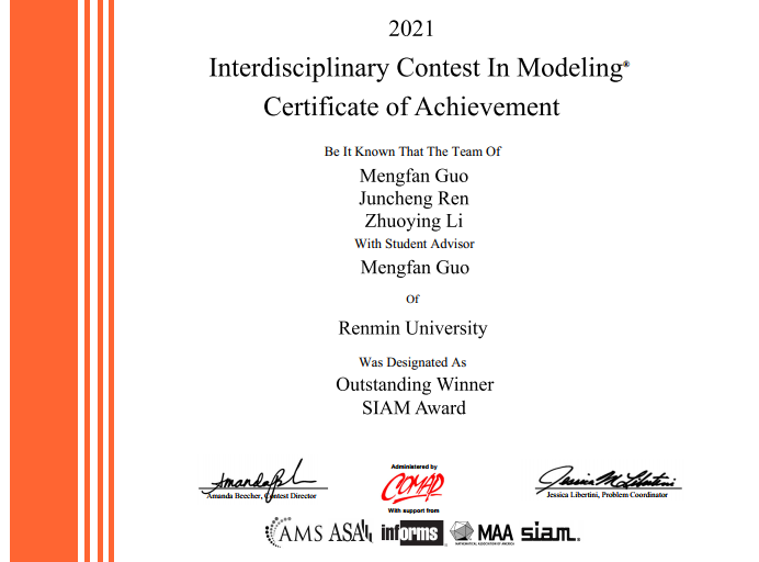 1 | 统计公司 | 郭梦璠 | 统计公司 | 任峻成 | 统计公司 | 李卓莹 | Outstanding Winner SIAM Award |
