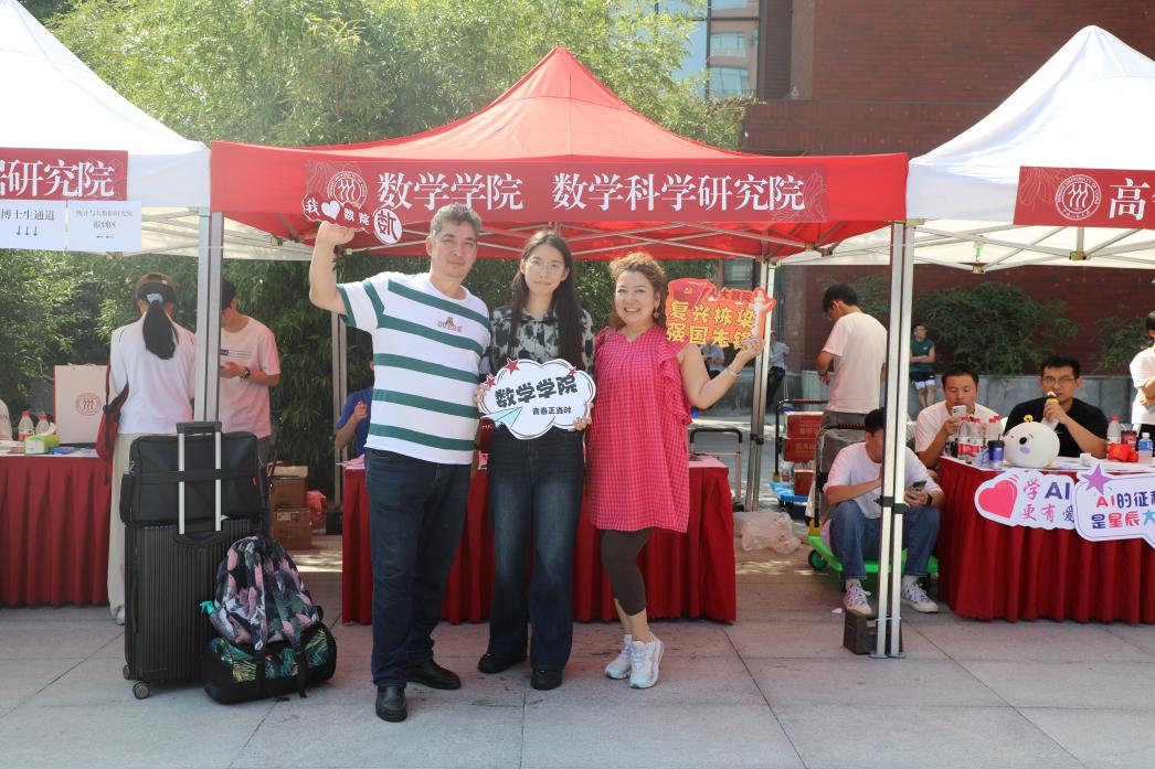 (古天乐代言太阳集团138新生和家长在迎新点打卡拍照)